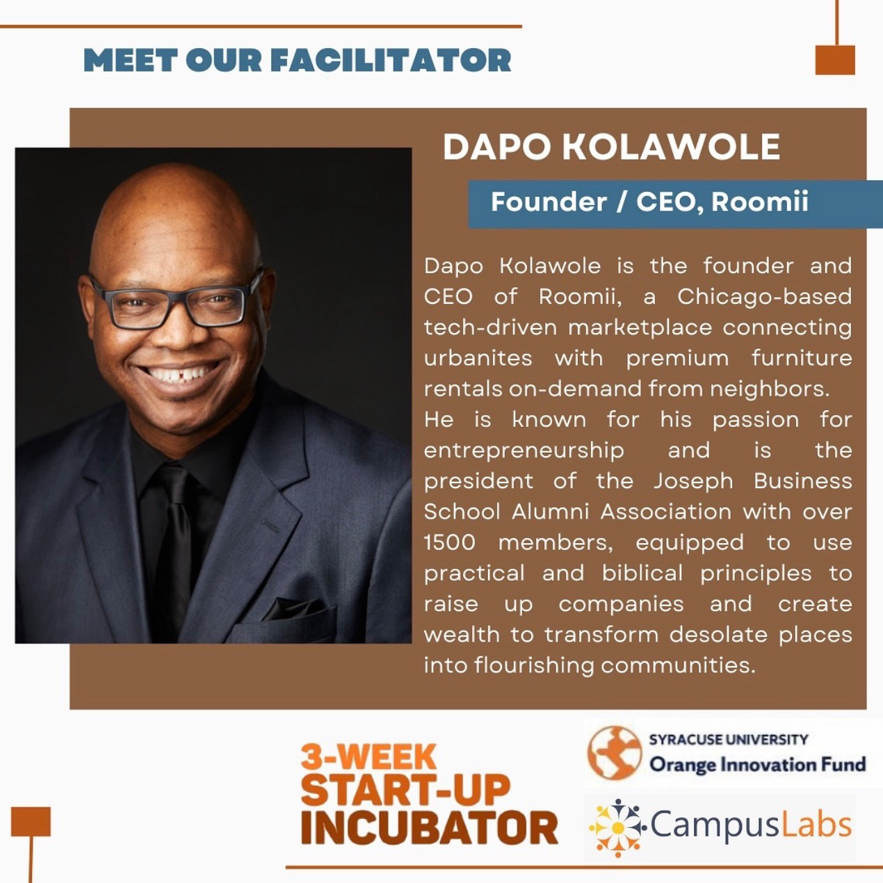 That foundation carried into his own path. His first real business began at the Toronto Harborfront Queen’s Quay Artisan Market, where he sold handcrafted jewelry and artwork and learned how to price products, tell a story, and connect directly with customers. He later founded a web design company, Plus5technologies, strengthening his skills in digital product creation and client-focused problem solving. Dapo and his wife later co-founded Citispoon, a dining app that helps people make faster dining decisions while enabling restaurants to reach nearby guests through a meaningful local advertising experience. Years later, a simple insight into the untapped value of everyday furniture led to Roomii, where Dapo now serves as Founder and CEO, building practical, human-centered solutions that help people unlock value from what they already own.